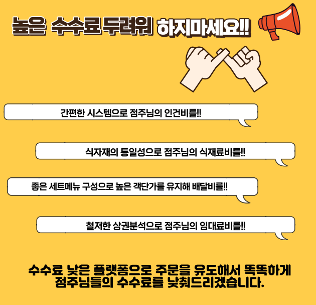 수수료 낮은 플랫폼으로 주문을 유도해서 똑똑하게 점주님들의 수수료를 낮춰드리겠습니다.